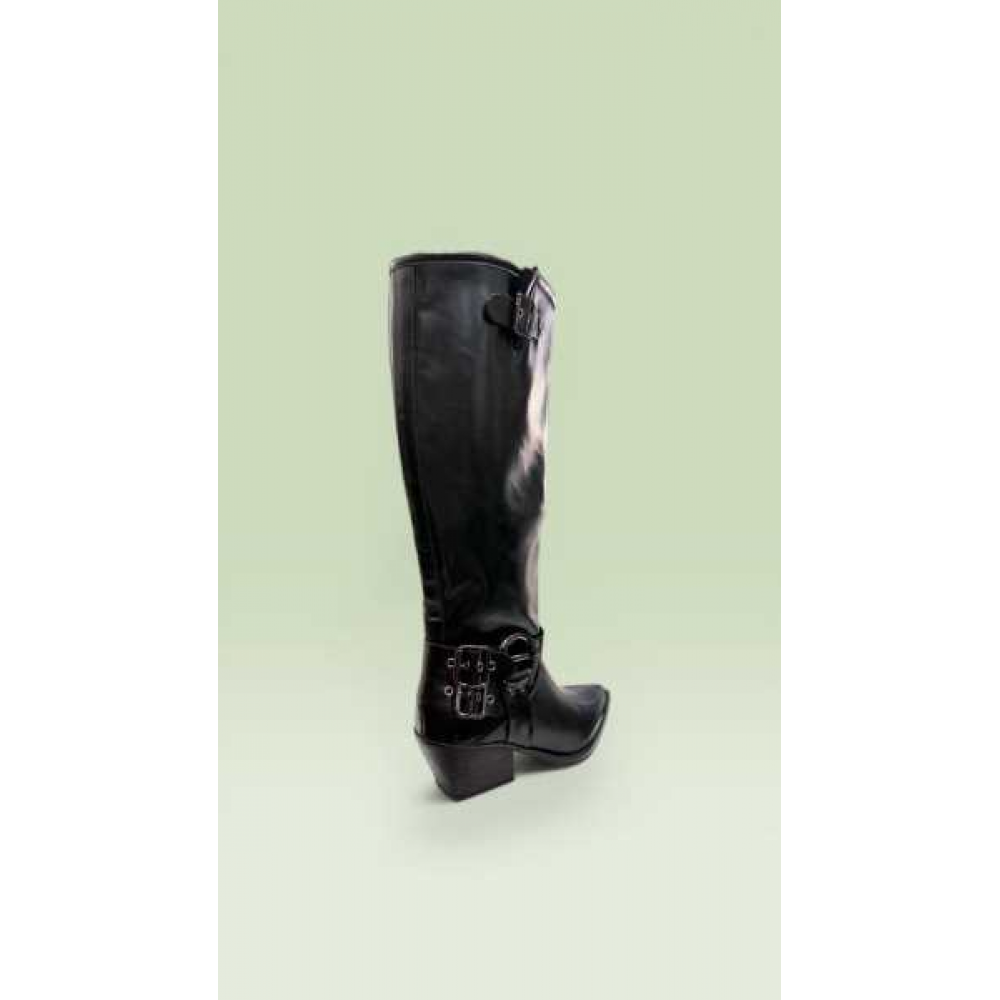 Questo stivale unisce l'estetica grintosa del mondo biker all'eleganza di un profilo slanciato. Realizzato in materiale sintetico dalla finitura semi-lucida, si distingue per i dettagli metallici e la punta decisa.