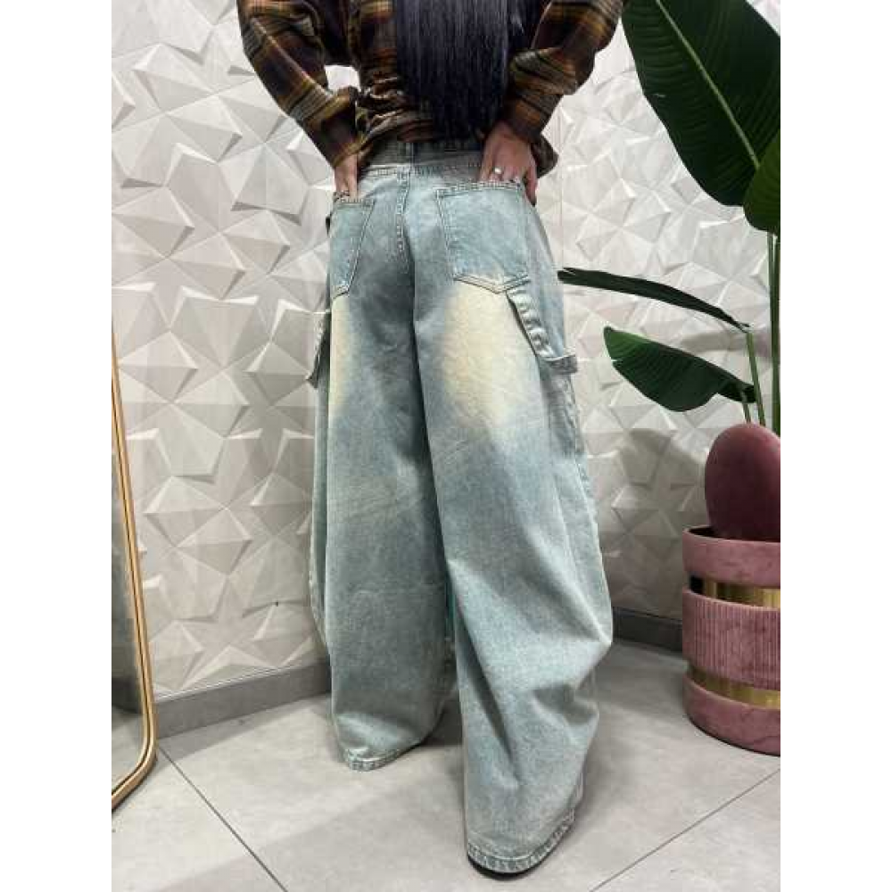 Lavaggio e Colore: Il denim è di un azzurro chiaro con un effetto slavato (acid wash) molto pronunciato. Sono presenti ampie zone più chiare, quasi bianche, concentrate sulla parte centrale della gamba e sul retro, che conferiscono un aspetto vintage e vissuto.