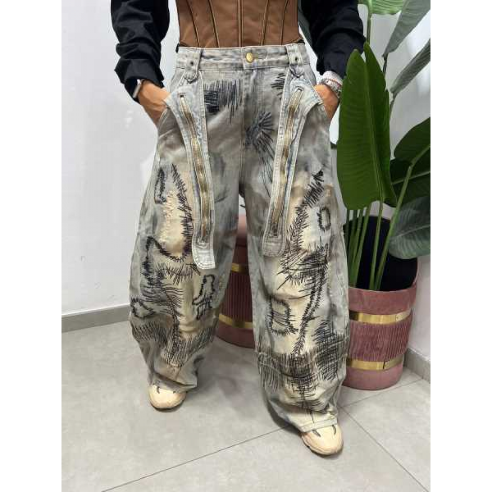 Jeans morbido con scritte e sfumature, dettaglio cinturini sul davanti, vestibilità non elastica
