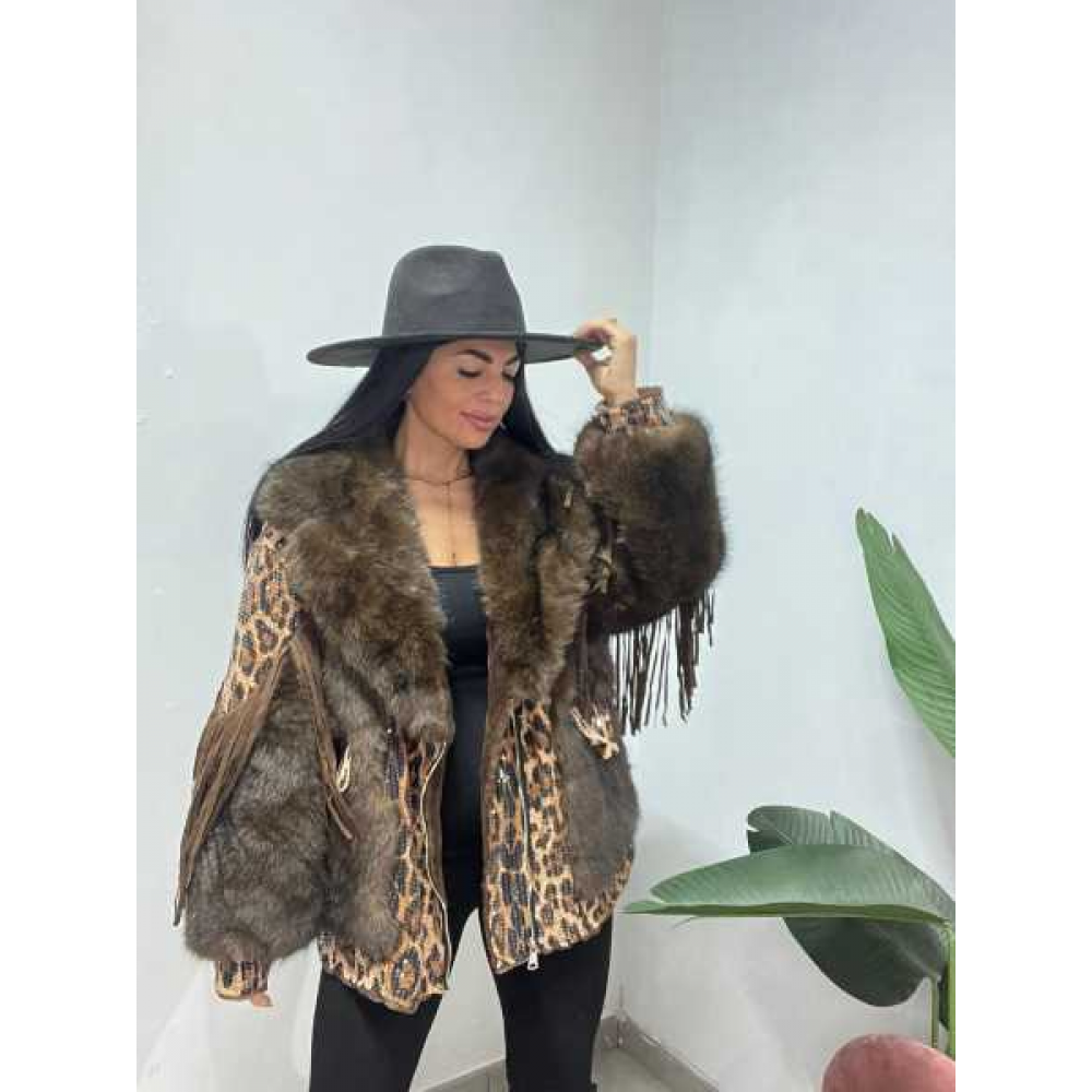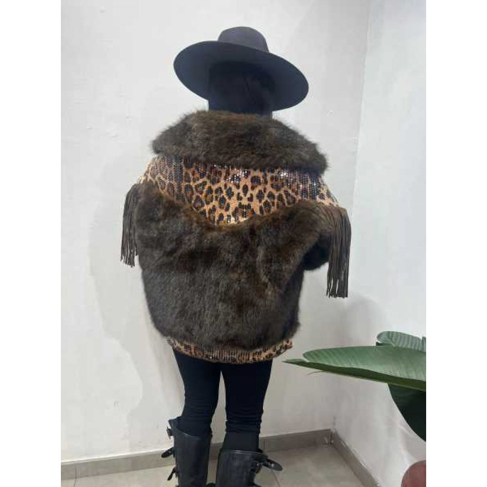Eco pelliccia foderata, modello over, con tasche laterali e dettaglio inserti in fantasia animalier con paillettes e maniche con frange. Chiusura frontale con zip decentrata