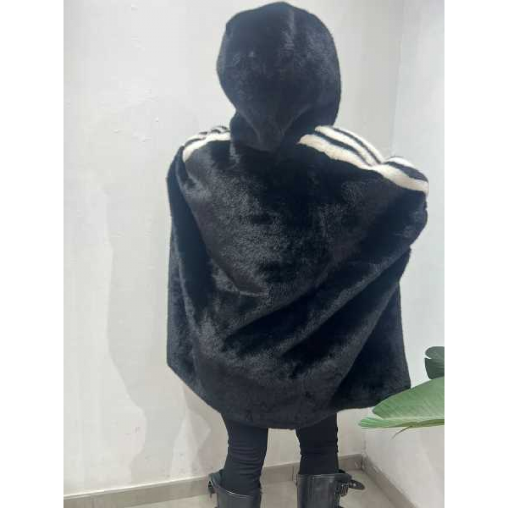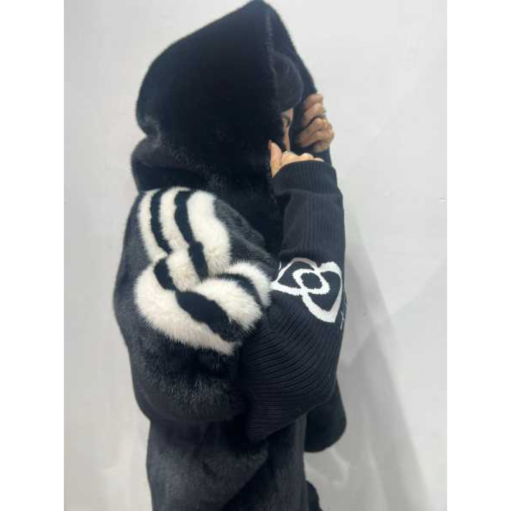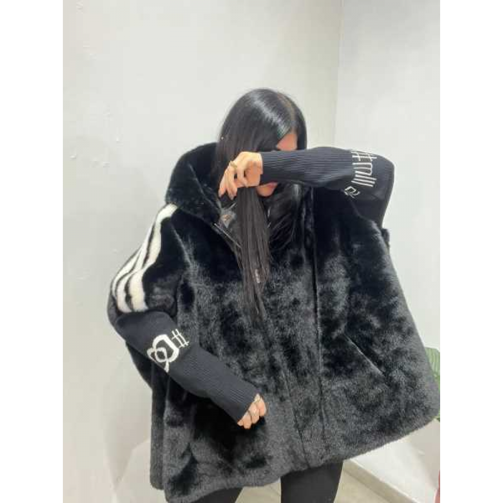 Pelliccia con zip sul davanti e cappuccio, dettaglio manica in filo con scritta, fit over.