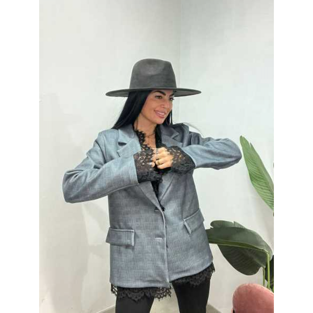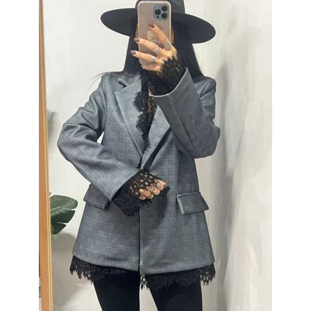 Giacca over monopetto foderata, in principe di galles, con spalline rinforzate, finte tasche frontali e inserti in pizzo.