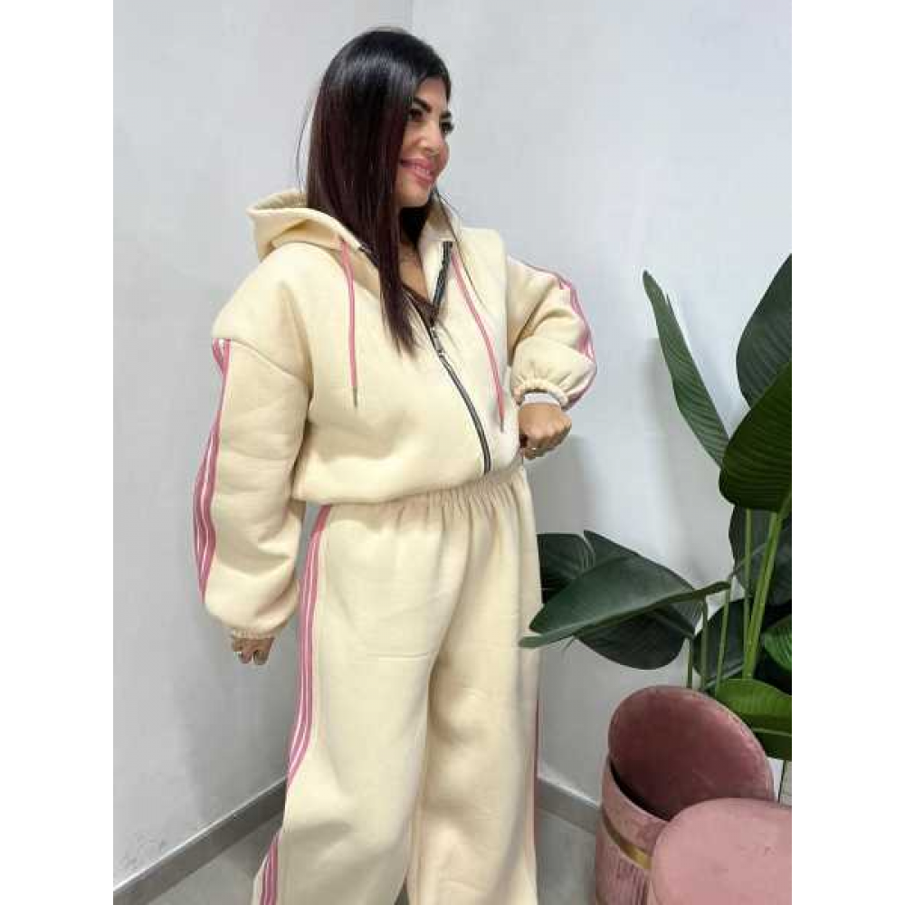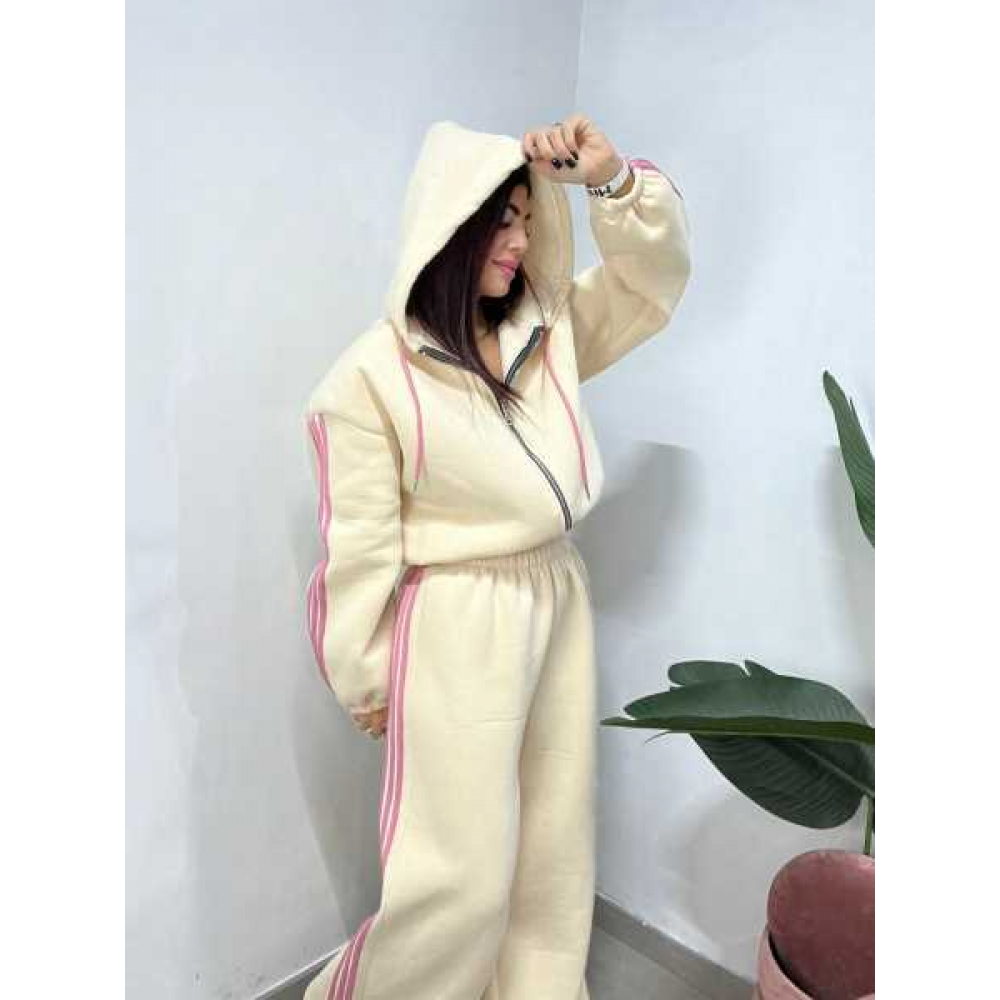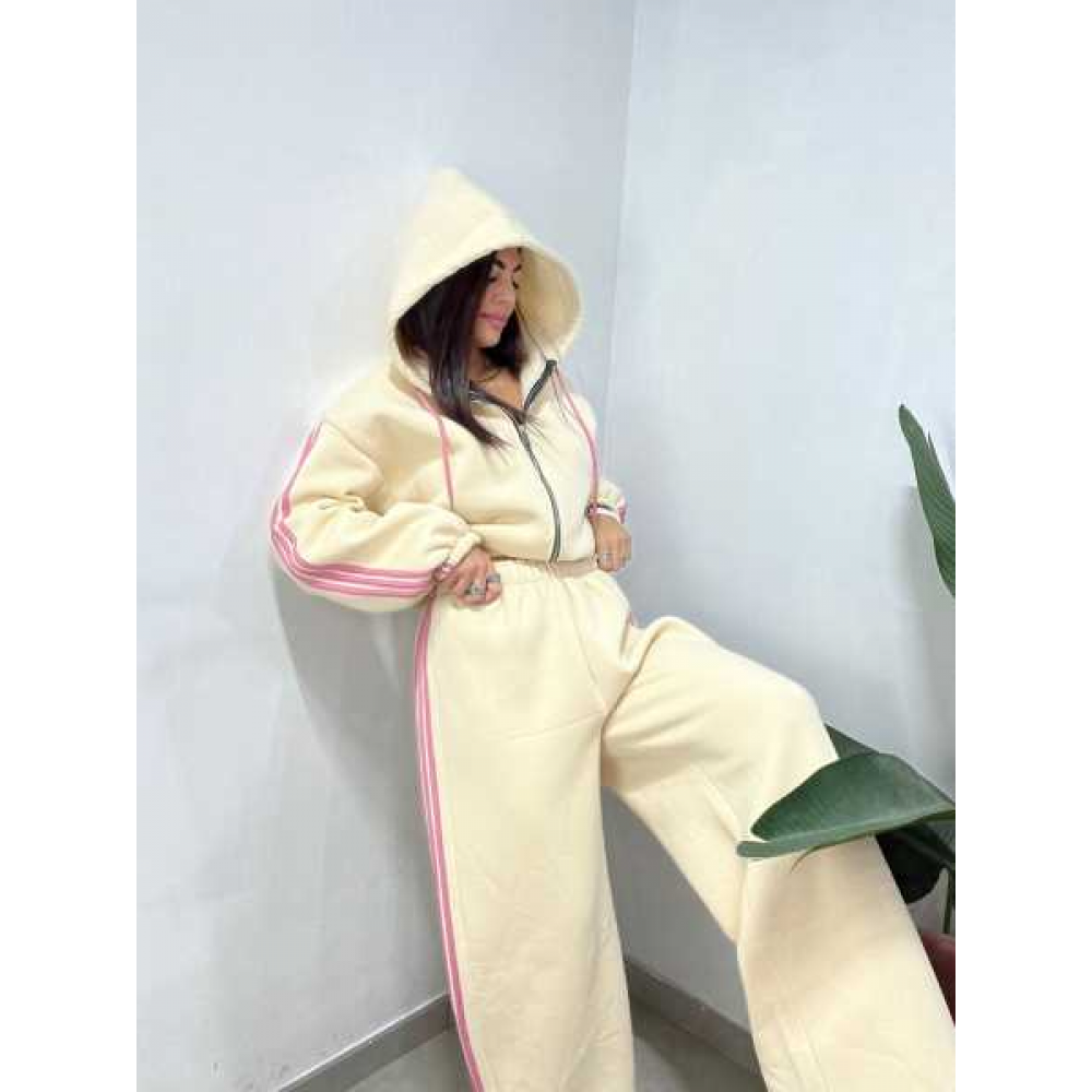 Coordset sportivo composto da felpa con zip corta e pantaloni a gamba larga coordinati presenta bande laterali a contrasto di colore .La felpa ha cappuccio con coulisse e un taglio leggermente crop, mentre i pantaloni sono a vita elastica