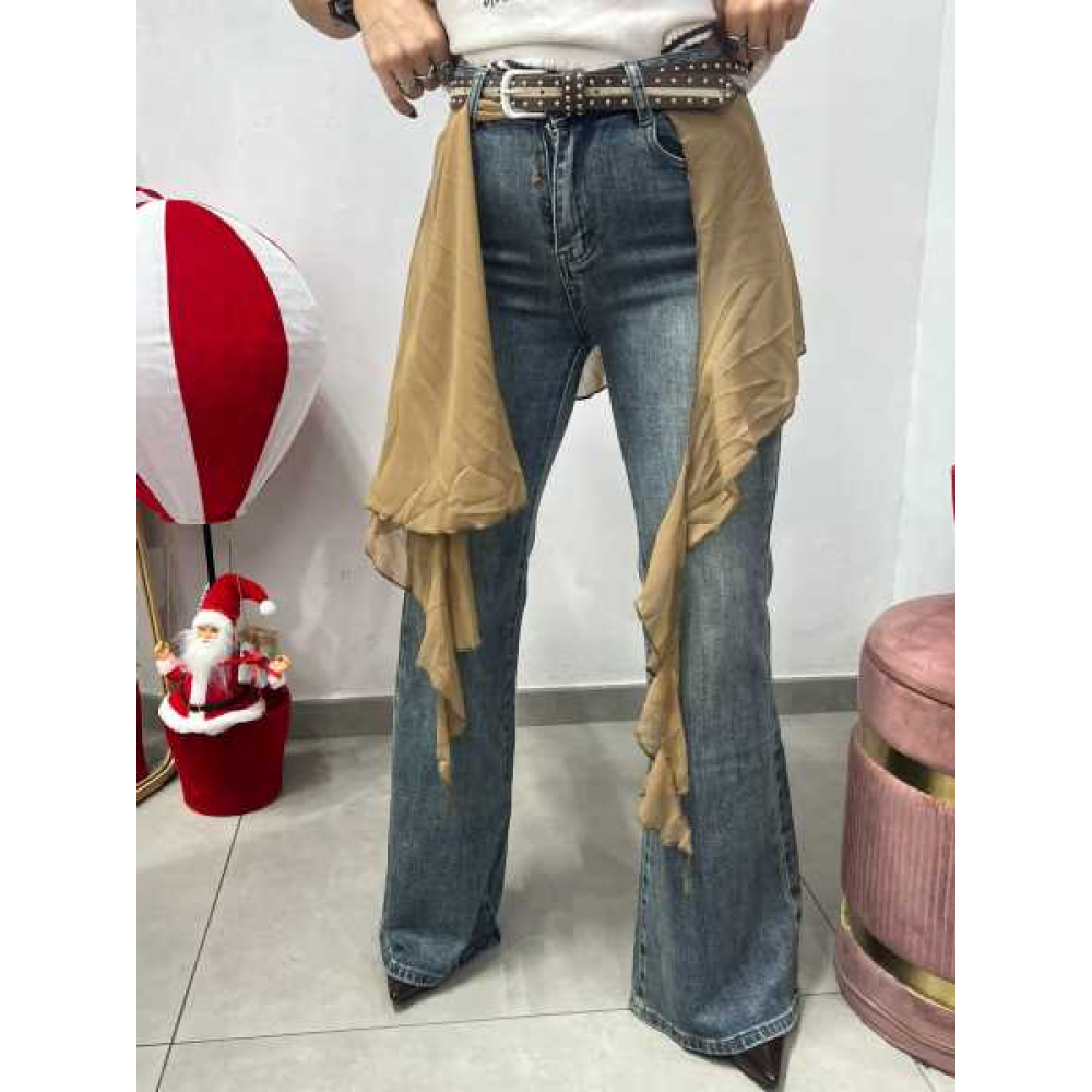 jeans a zampa con cintura borchiata e un pannello in tessuto velato color cammello. tessuto elastico