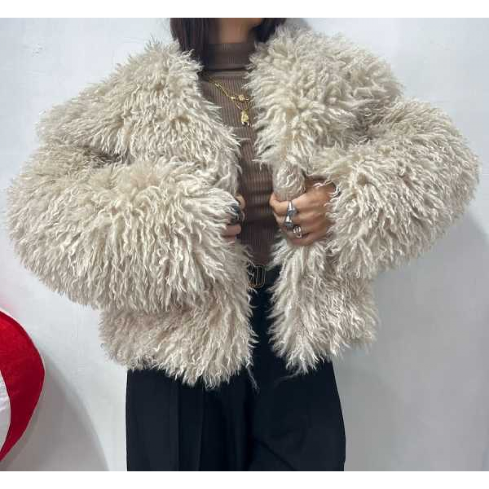 Eco pelliccia foderata, modello corto, in tessuto kalgan, con collo revers classico e chiusura a scomparsa con ganci.