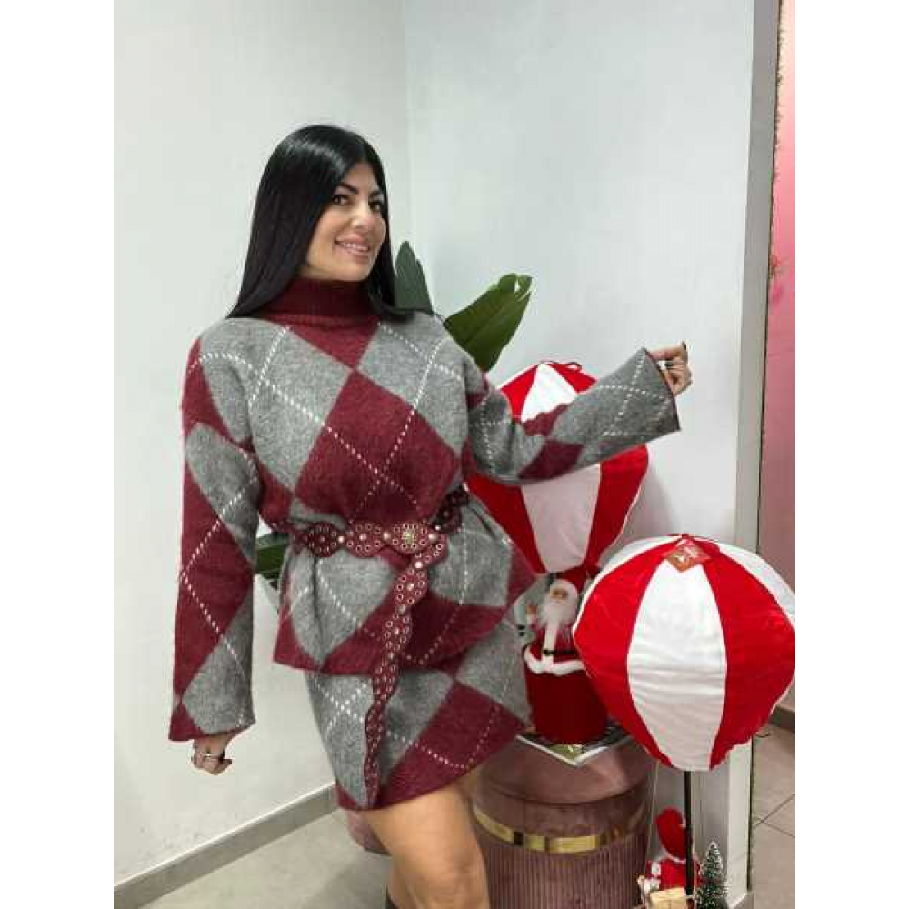 Coordinato in misto lana, composto da maglione manica lunga, collo alto morbido, lunghezza regolare, elastico. Minigonna vita alta con elastico in vita. Trama rombi, elastica