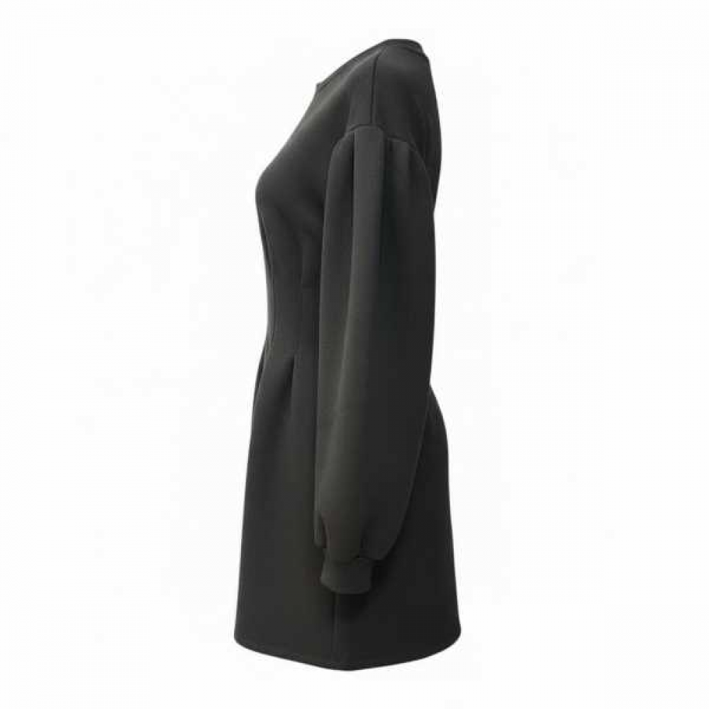 Si tratta di un mini-abito o abito corto in un tessuto strutturato e compatto (probabilmente scuba, neoprenico o felpato pesante) di colore nero.