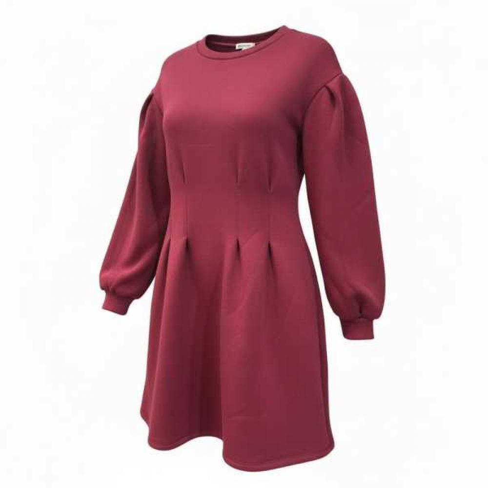 Materiale e Stile: Anche questo è realizzato in un tessuto strutturato che mantiene la forma voluminosa delle maniche a palloncino e della gonna svasata, con la vita stretta e pinces sul corpetto.