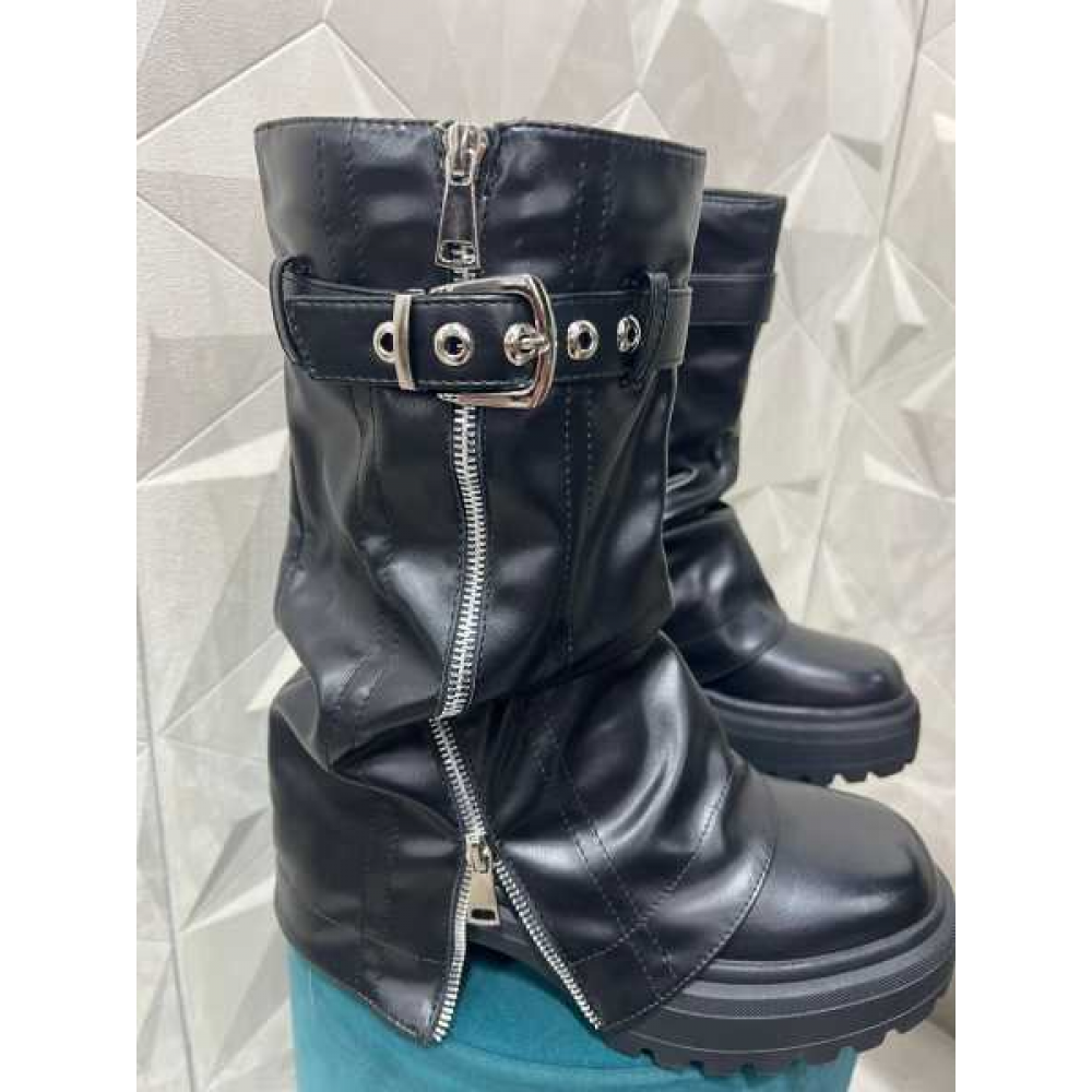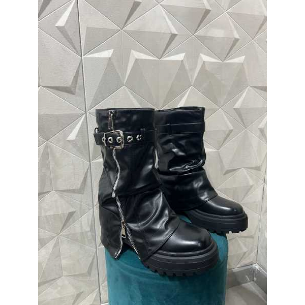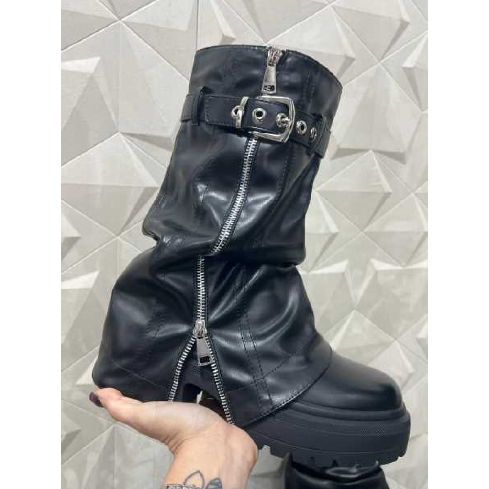 Dettagli Metallici: L'elemento più vistoso è la lunga zip argentata decorativa che corre in diagonale lungo tutto il fronte e il lato dello stivale. Nella parte superiore del gambale è presente un cinturino con fibbia metallica lucida e occhielli rinforzati, che richiama lo stile dei classici stivali da motociclista.
