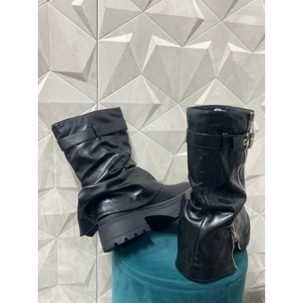 Design e Silhouette: Lo stivale ha un gambale di media altezza con una struttura morbida e abbondante (effetto slouchy), che crea delle pieghe naturali sulla caviglia. La punta è arrotondata e voluminosa, conferendo un aspetto robusto.