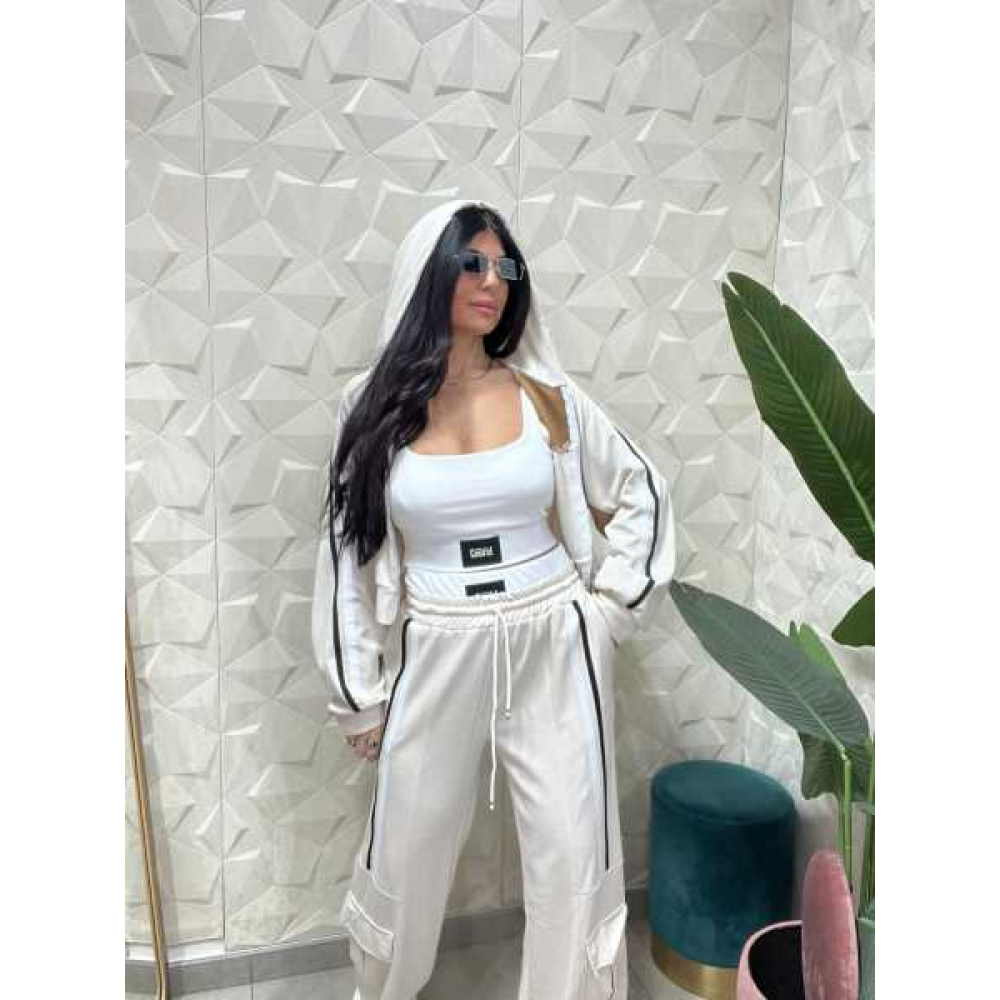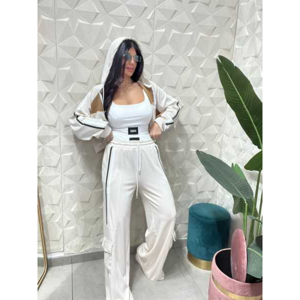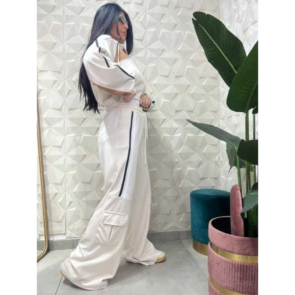 Design: Presenta profili o bande laterali a contrasto ,lungo le maniche e i lati esterni dei pantaloni.
