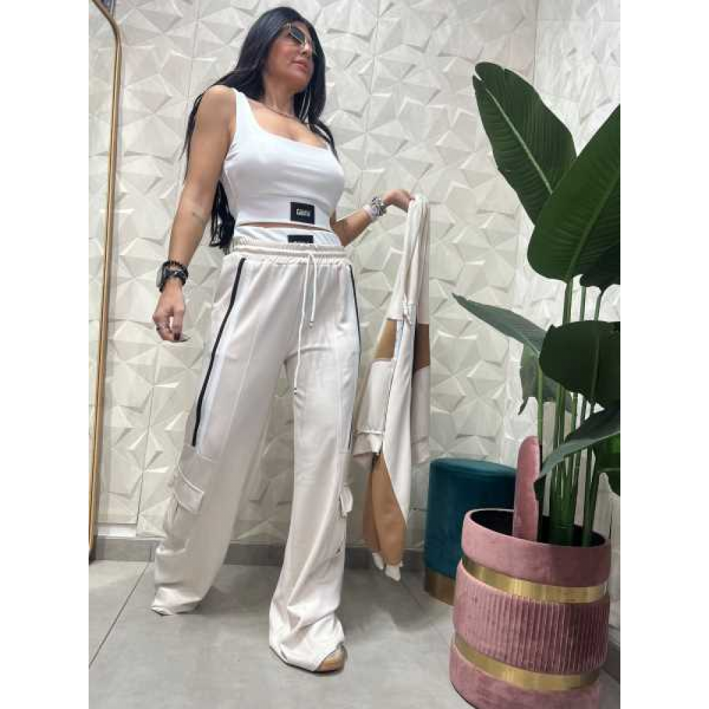 Pantaloni: Pantaloni larghi, stile cargo, con coulisse in vita e tasche laterali applicate sulle cosce.