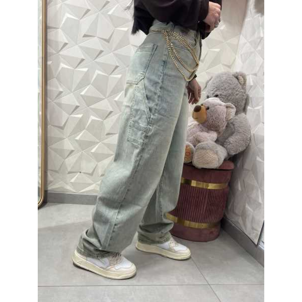 Lavaggio: Il denim presenta un lavaggio chiaro (light wash) con un effetto leggermente "acido" o marmorizzato, tipico dello stile vintage. Sono visibili sfumature più chiare sulle cosce che conferiscono un aspetto vissuto.