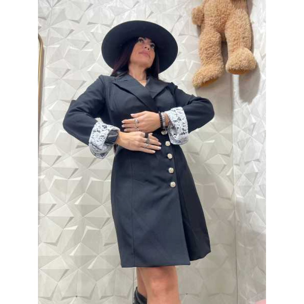 Polsini in Pizzo: Il vero protagonista dell'abito sono i maestosi polsini in pizzo bianco lavorato, che creano un contrasto cromatico netto e super chic con il nero profondo del tessuto.