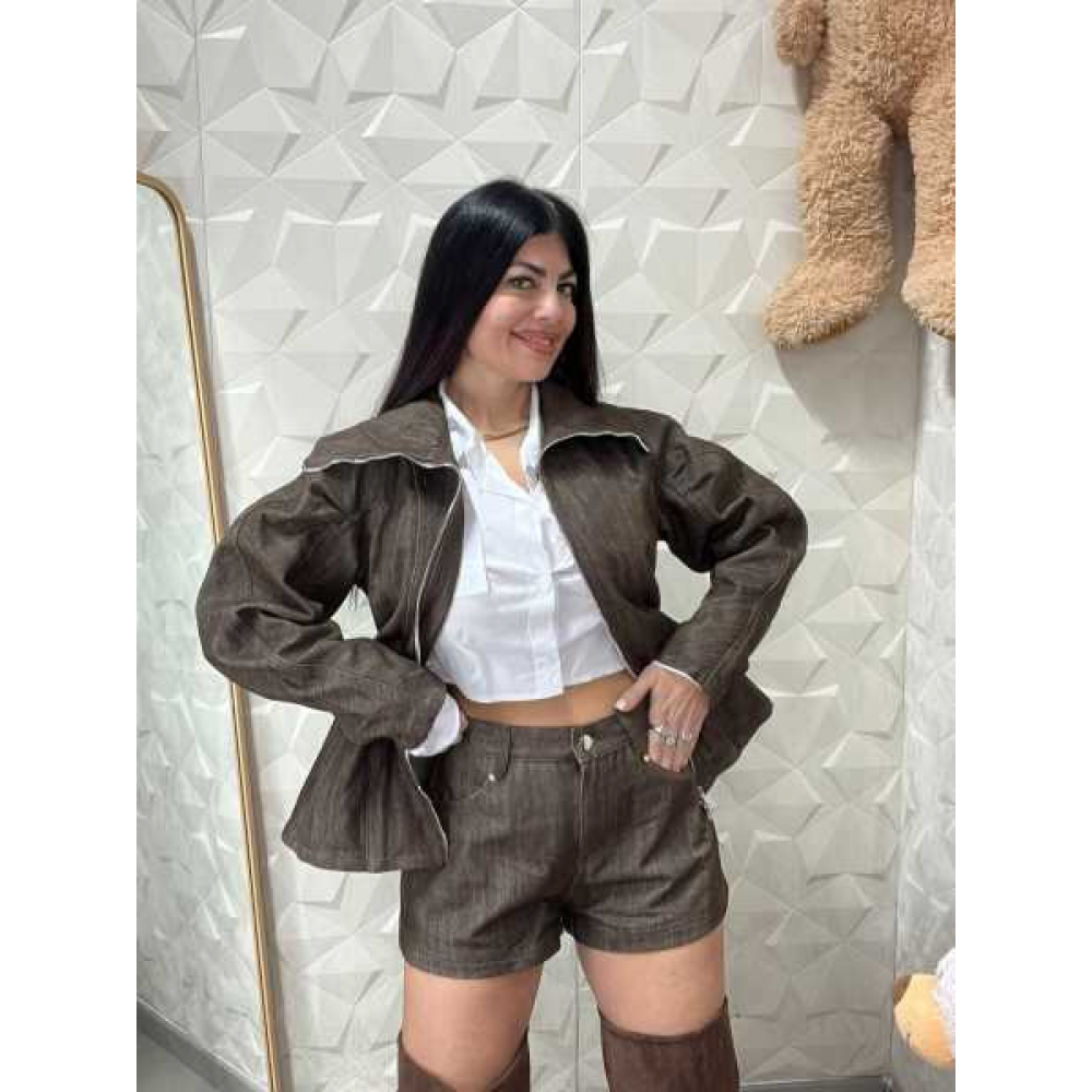 Shorts Coordinati: Taglio classico a vita alta, realizzati nello stesso lavaggio denim dark per un look coerente e slanciato.