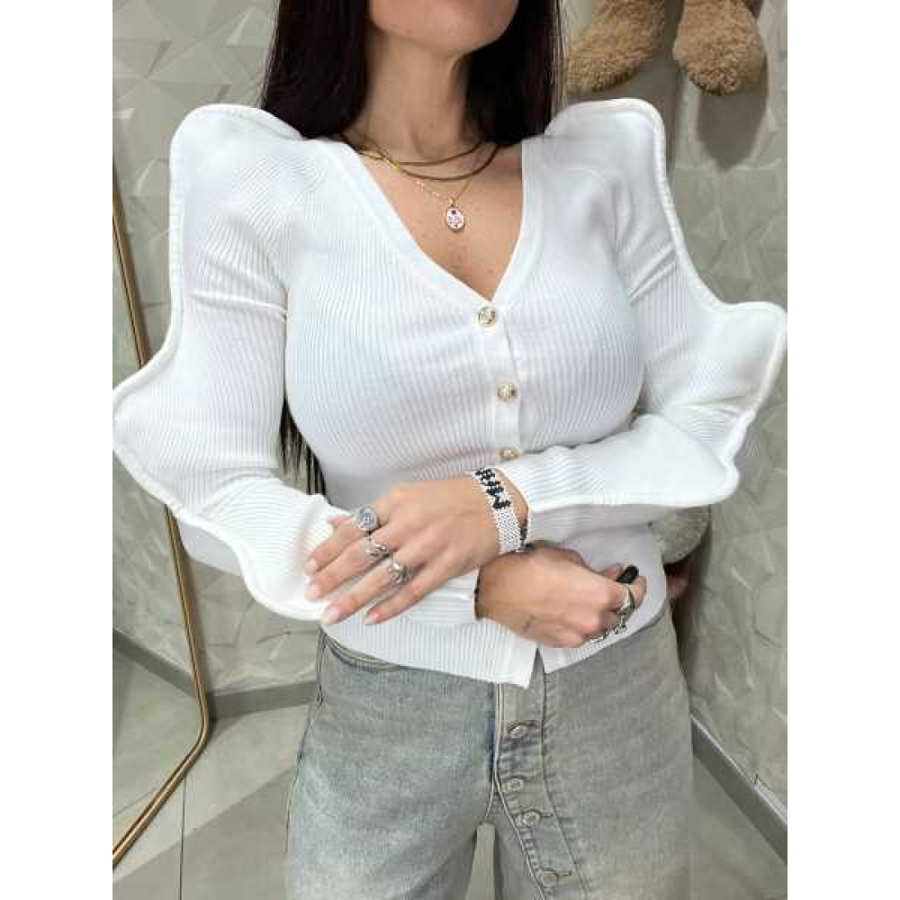 Design delle Maniche: Il vero punto di forza sono le maniche con lavorazione a volant strutturato che crea un effetto scultoreo lungo tutto il braccio, donando volume e movimento.