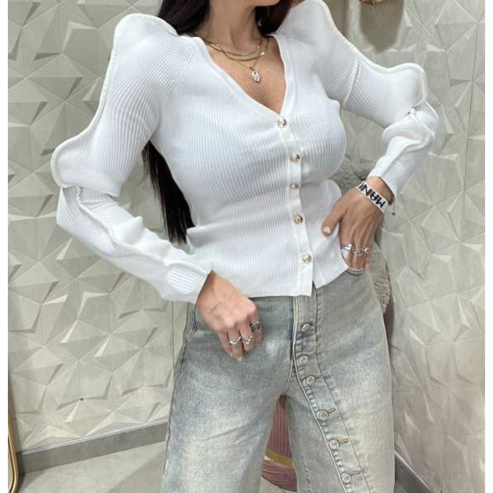 Scollo e Chiusura: Raffinato scollo a V che valorizza il décolleté, arricchito da una fila di bottoni gioiello dorati che aggiungono un punto luce prezioso al capo.