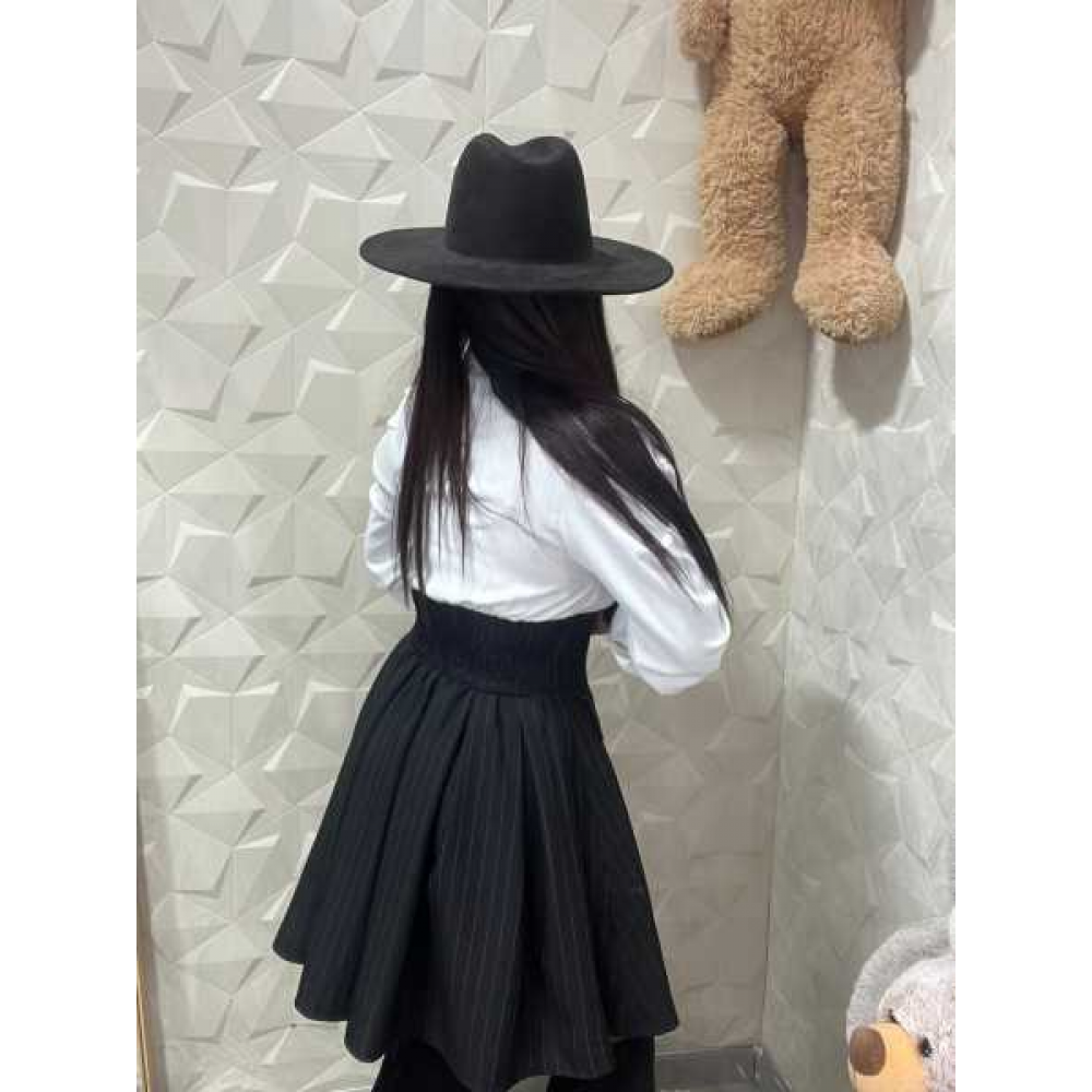 Gonna a Vita Alta Gessata: La parte inferiore simula una gonna a ruota gessata in tonalità testa di moro/antracite. Il design a corsetto a vita alta modella la silhouette, enfatizzato da una fila di bottoni dorati decorativi che richiamano lo stile militare-chic.