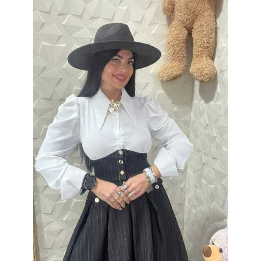 Top in Stile Blusa: La parte superiore è realizzata in un tessuto bianco fluido, caratterizzato da scenografiche maniche a sbuffo con spalline strutturate e polsini alti. Il colletto a punta è impreziosito da un raffinato inserto gioiello dorato (rimovibile) che dona un punto luce immediato.
