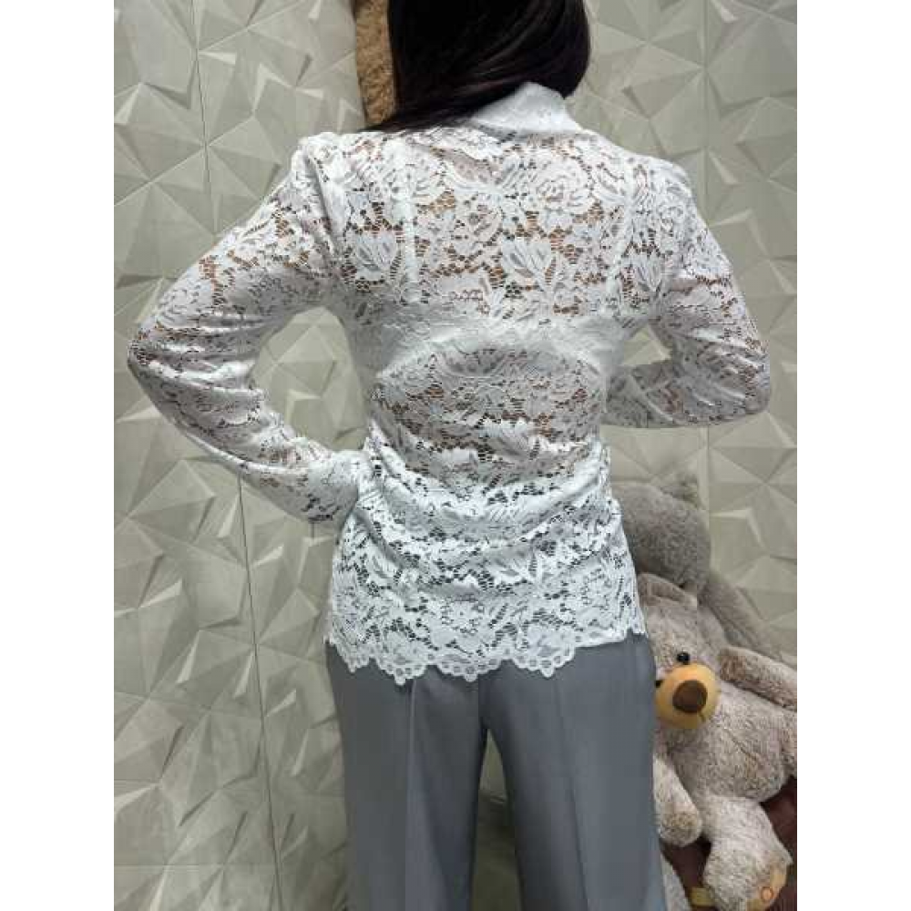 Camicia trasparente in pizzo ricamato con motivi floreali, versatile e di grande impatto visivo.