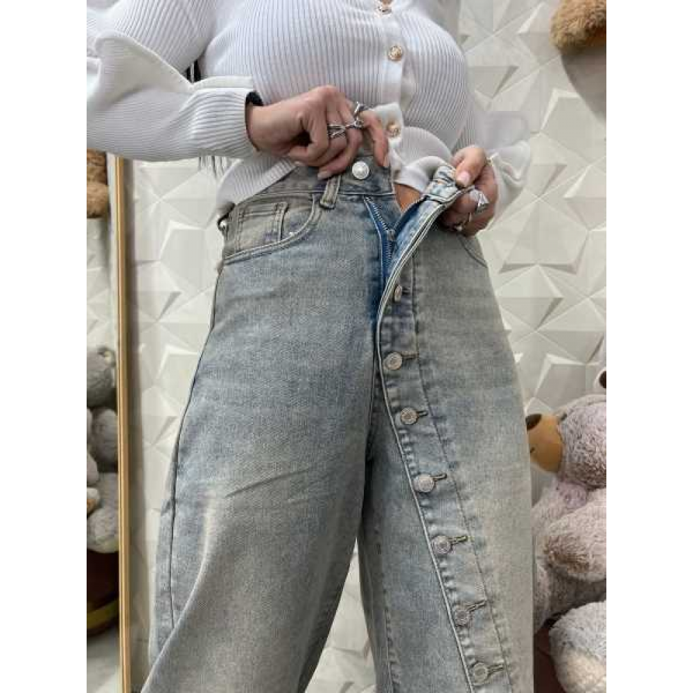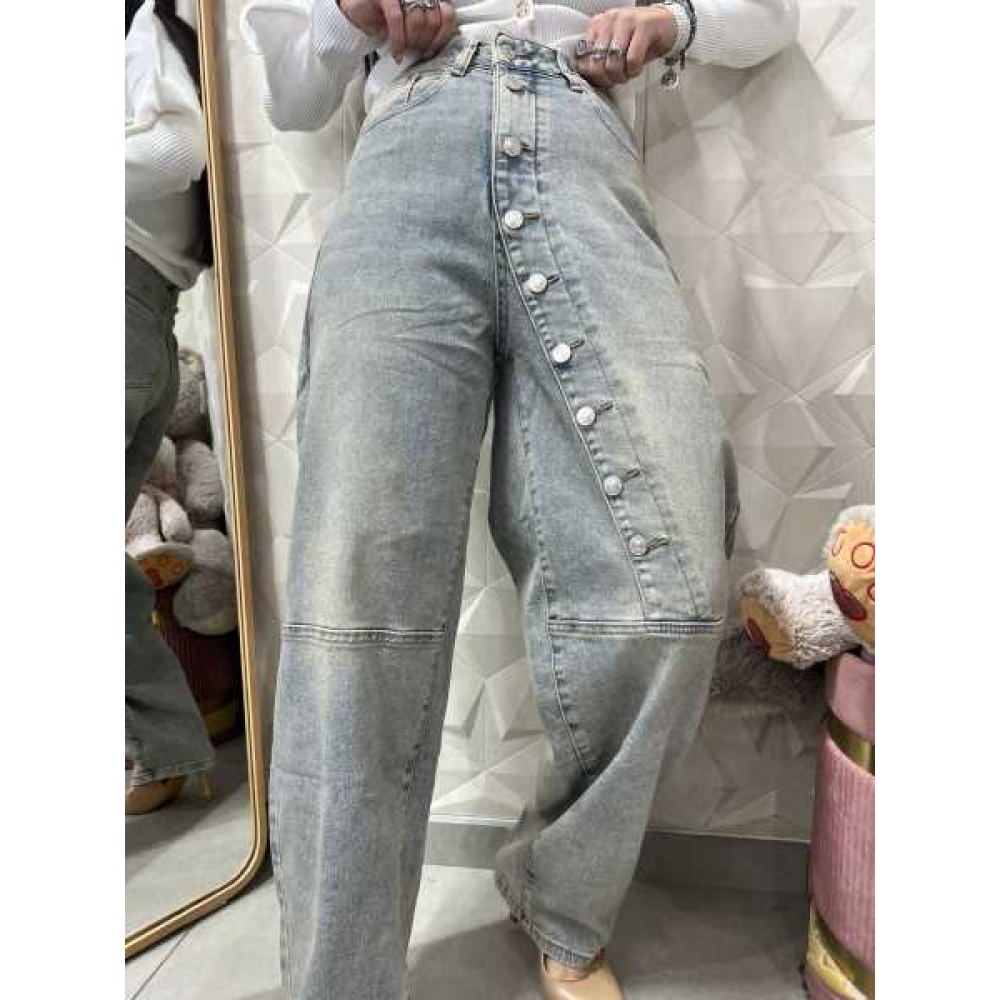 Design Unico: Chiusura frontale asimmetrica con una fila diagonale di bottoni metallici a vista che scende lungo la gamba, aggiungendo un tocco strutturale e originale.
