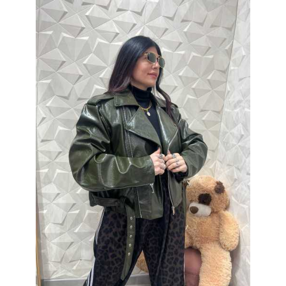 Questa giacca biker oversize è il capospalla definitivo per chi cerca un look grintoso, moderno e di carattere. Realizzata in ecopelle di alta qualità con una sofisticata finitura semilucida, combina il design classico del "chiodo" con volumi contemporanei e una tonalità verde bosco profonda e magnetica.