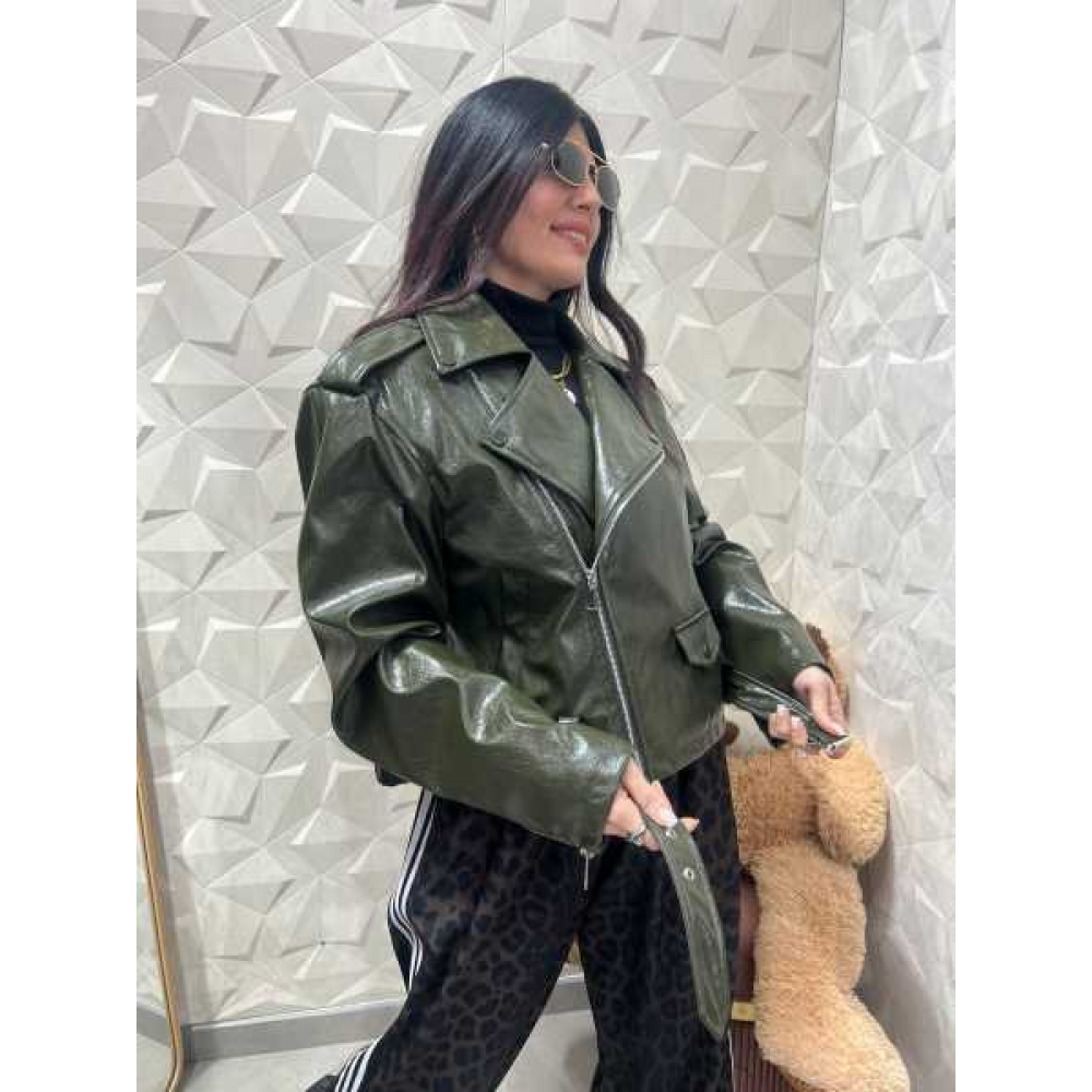 Eleva il tuo stile street con questa giacca biker dal taglio generoso e oversize. La sua struttura ampia e rilassata ridefinisce i canoni del classico chiodo, offrendo una vestibilità comoda senza rinunciare a un'estetica rock-chic. La finitura semilucida della morbida ecopelle cattura la luce in modo discreto, esaltando la ricchezza del colore verde oliva scuro.