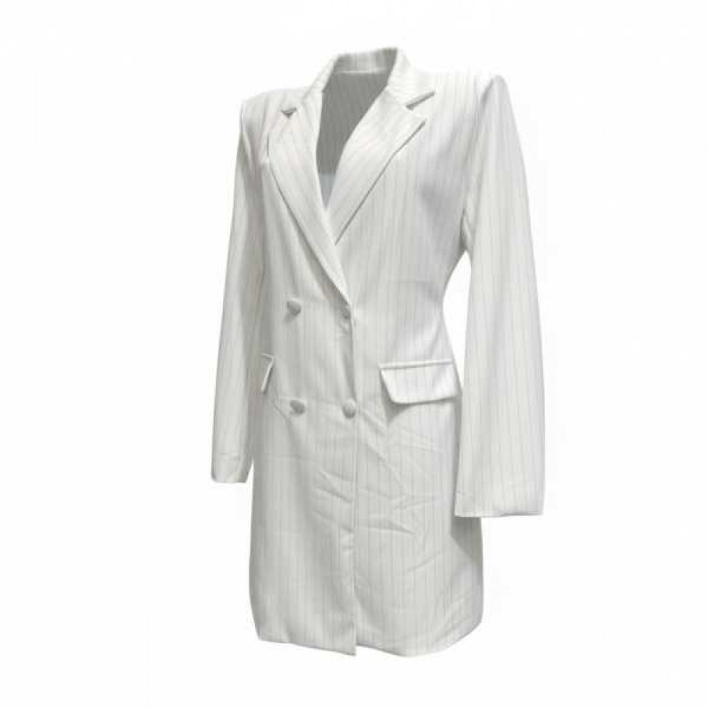 Dettaglio Gessato: La sottile riga verticale bianca su base scura allunga otticamente la figura, offrendo un'estetica "Power Suit" sempre attuale.