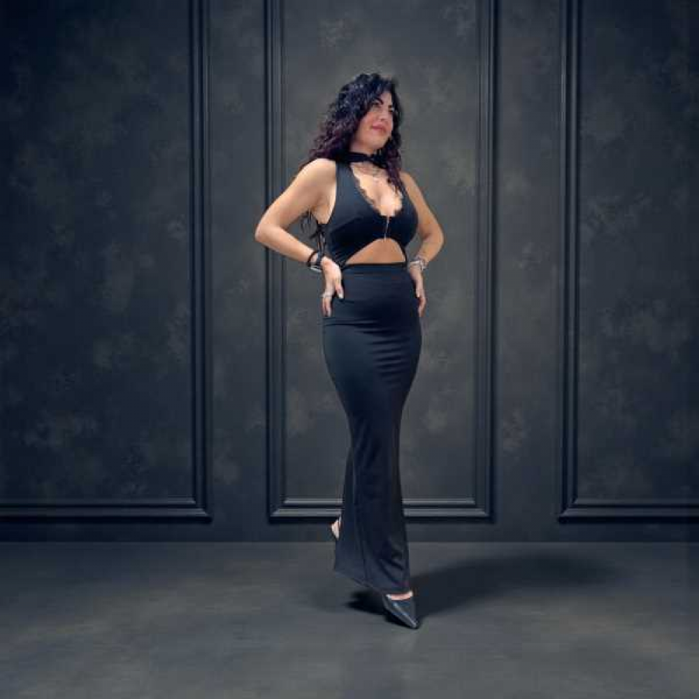 Lunghezza e Spacco: L'abito scende fino alle caviglie. Nella parte posteriore, come mostrato nell'ultimo scatto, è presente uno spacco centrale profondo che non solo facilita la camminata, ma aggiunge un elemento dinamico al design.