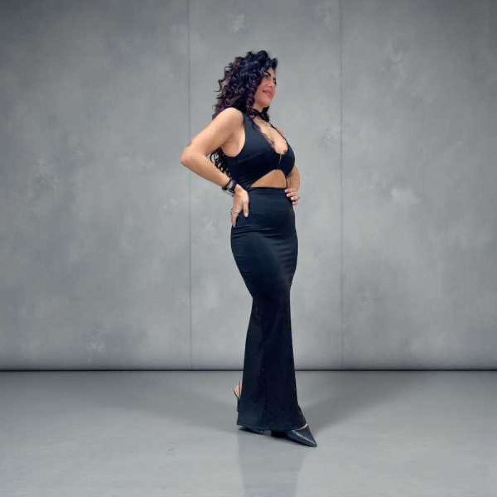Dettaglio Cut-out: La caratteristica distintiva è l'apertura sotto il seno (taglio cut-out) che lascia scoperta la parte superiore dell'addome, creando un effetto visivo simile a un set coordinato top e gonna.