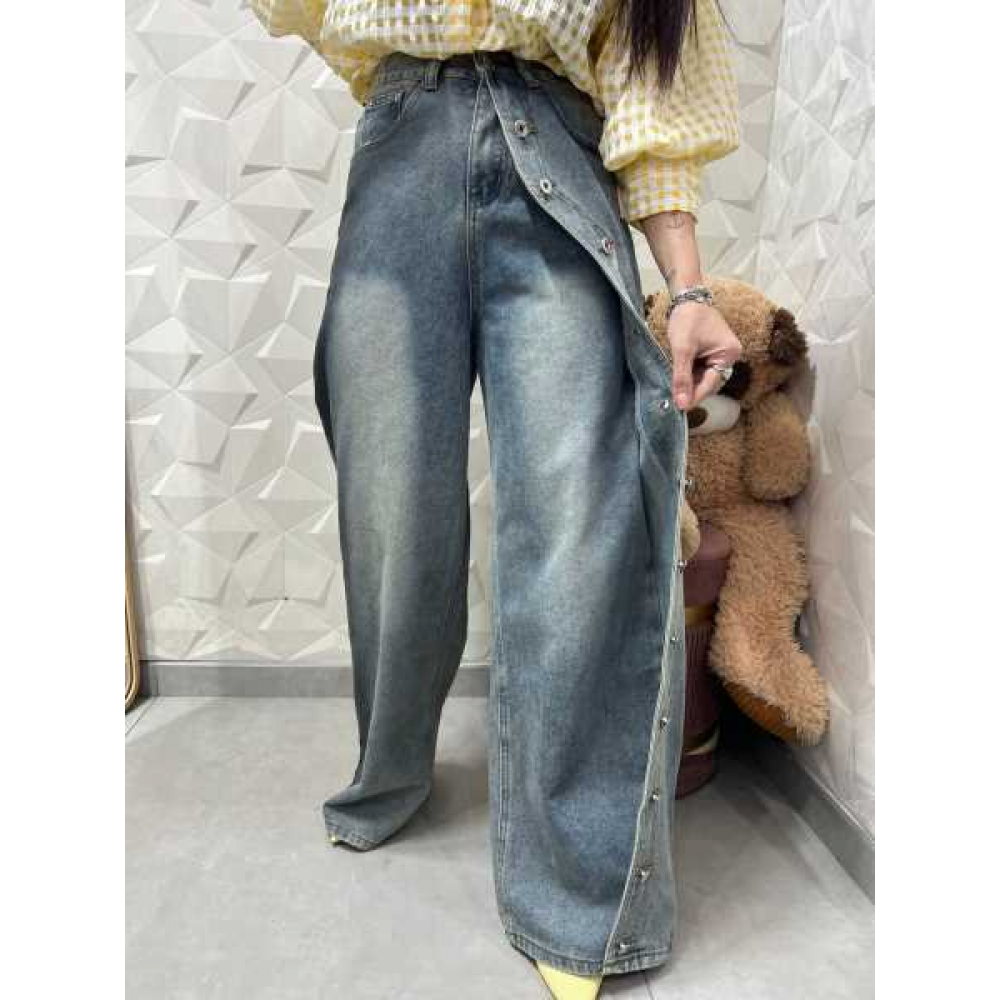 Dettaglio Laterale con Bottoni: Una fila di bottoni a pressione corre lungo la gamba sinistra, permettendoti di giocare con l’apertura e creare uno spacco personalizzato.