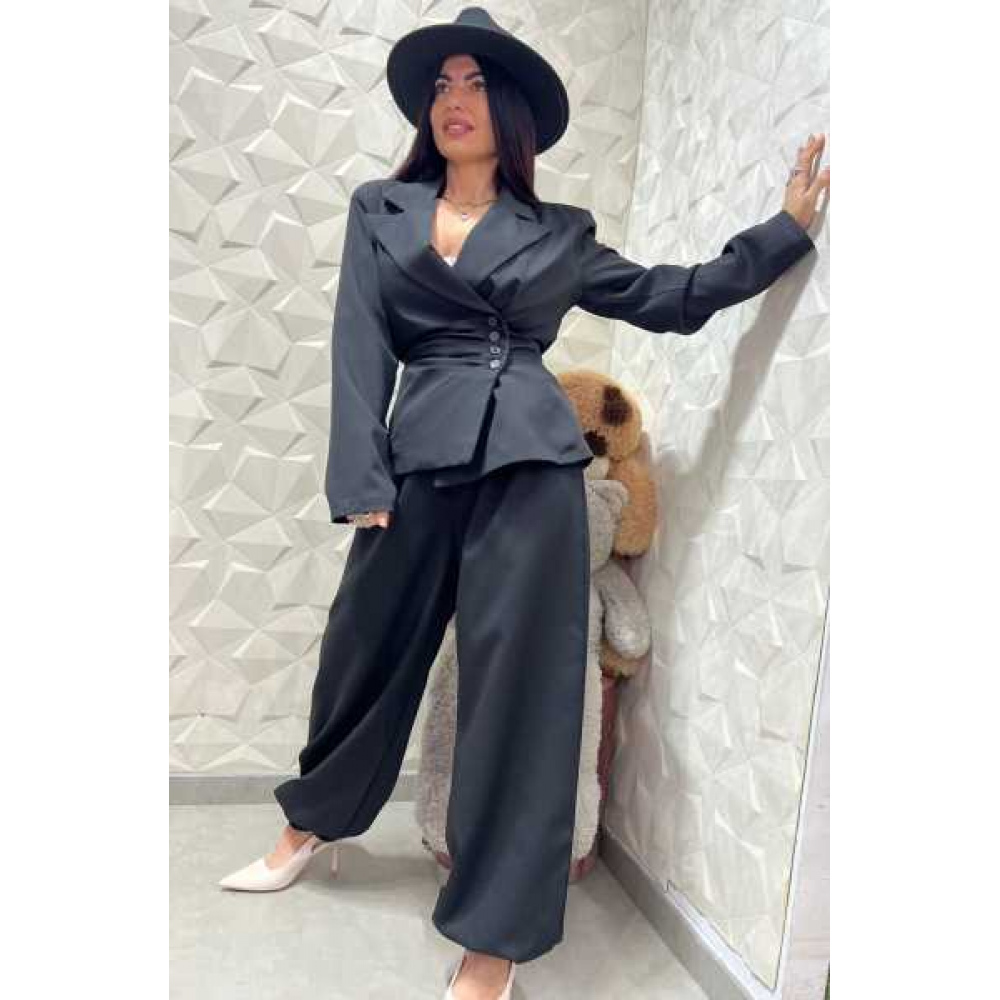 Blazer Strutturato: La giacca presenta un'allacciatura asimmetrica con bottoni laterali che creano un sofisticato gioco di drappeggi in vita, esaltando la silhouette. Le spalline imbottite conferiscono carattere e una struttura decisa.