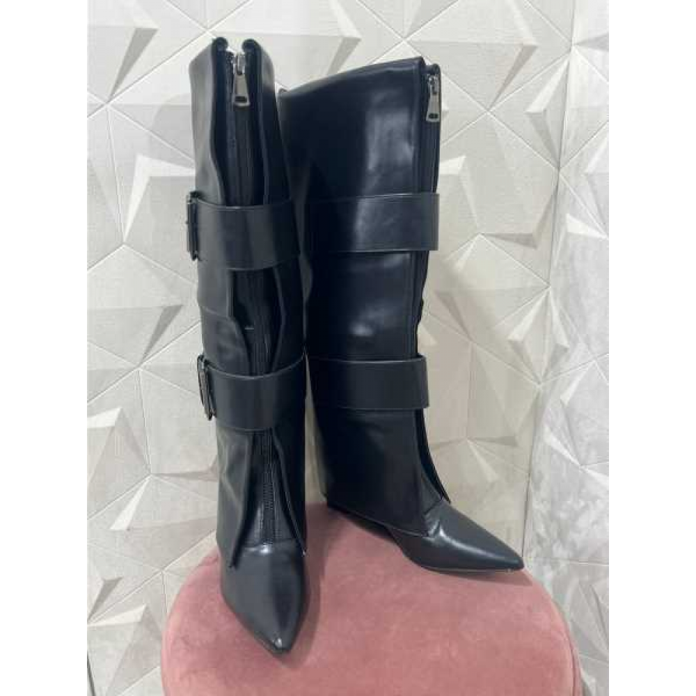 Punta Sfilata: La punta affusolata dona slancio alla figura, bilanciando perfettamente il volume audace del gambale.