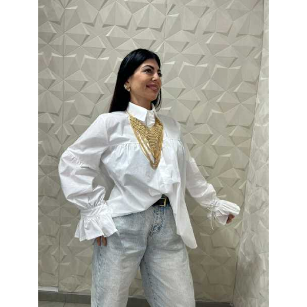 Maniche Protagoniste: La vera particolarità sono le maniche a palloncino, rifinite con un polsino alto elasticizzato che sfocia in un delicato volant (rouches) finale.