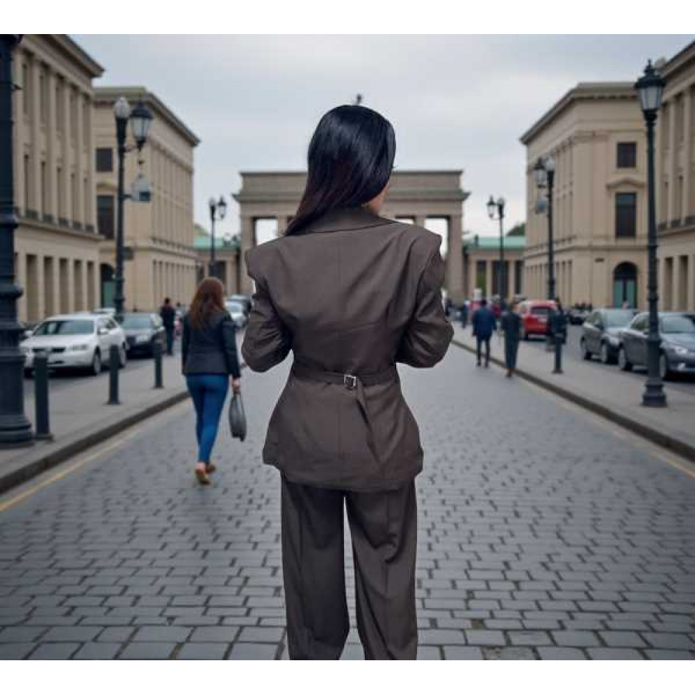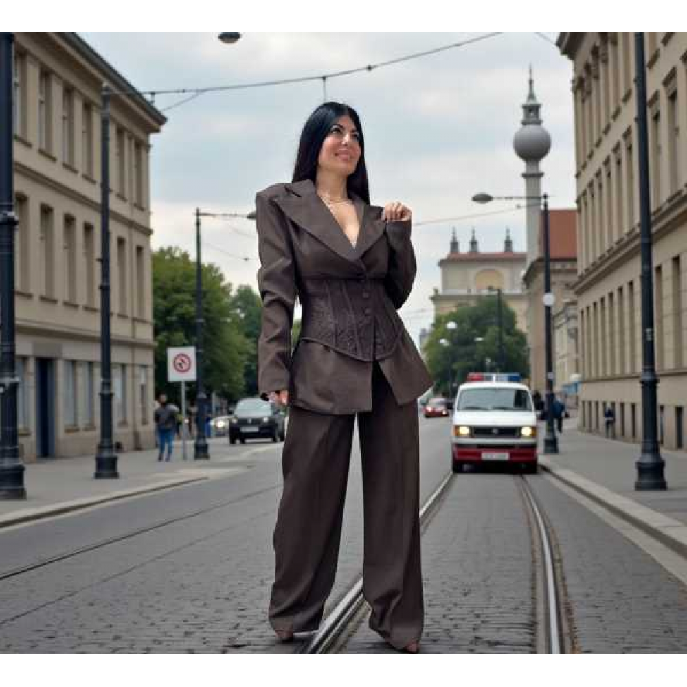 Blazer Strutturato con Corsetto: Il pezzo forte del set. Una giacca dal taglio over con spalline accentuate e rever a lancia, arricchita da un inserto a corsetto in pizzo tono su tono. La chiusura frontale a tre bottoni e il dettaglio del corsetto definiscono il punto vita, creando una silhouette a clessidra impeccabile.