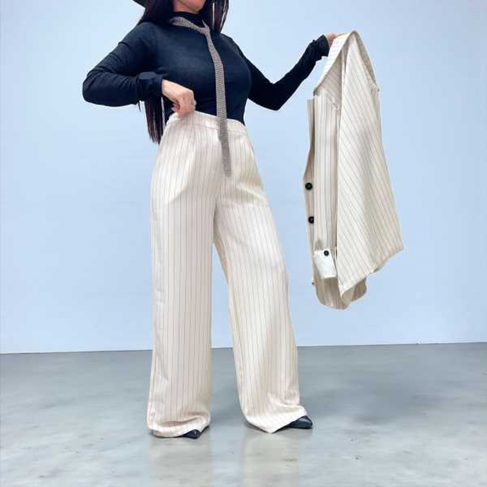Taglio: Wide-leg (gamba ampia) a vita alta con eleganti pinces frontali che garantiscono una vestibilità impeccabile e allungano otticamente la figura.