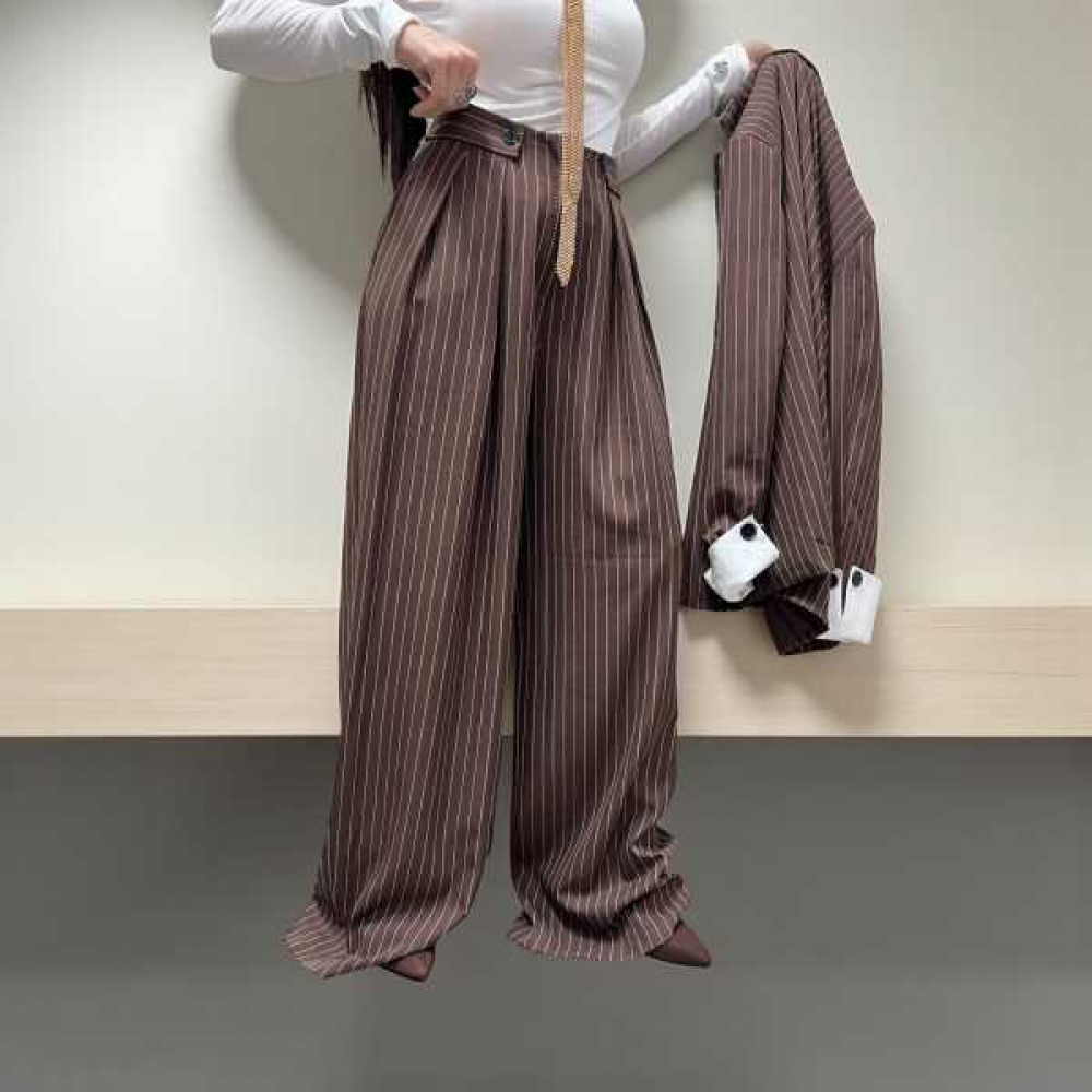 Taglio: Wide-leg (gamba ampia) a vita alta con eleganti pinces frontali che garantiscono una vestibilità impeccabile e allungano otticamente la figura.