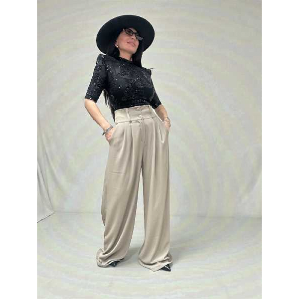 Design a Vita Alta: Il fascione alto con chiusura a doppio bottone definisce il punto vita, mentre le pinces frontali aggiungono volume e un tocco raffinato di ispirazione maschile.