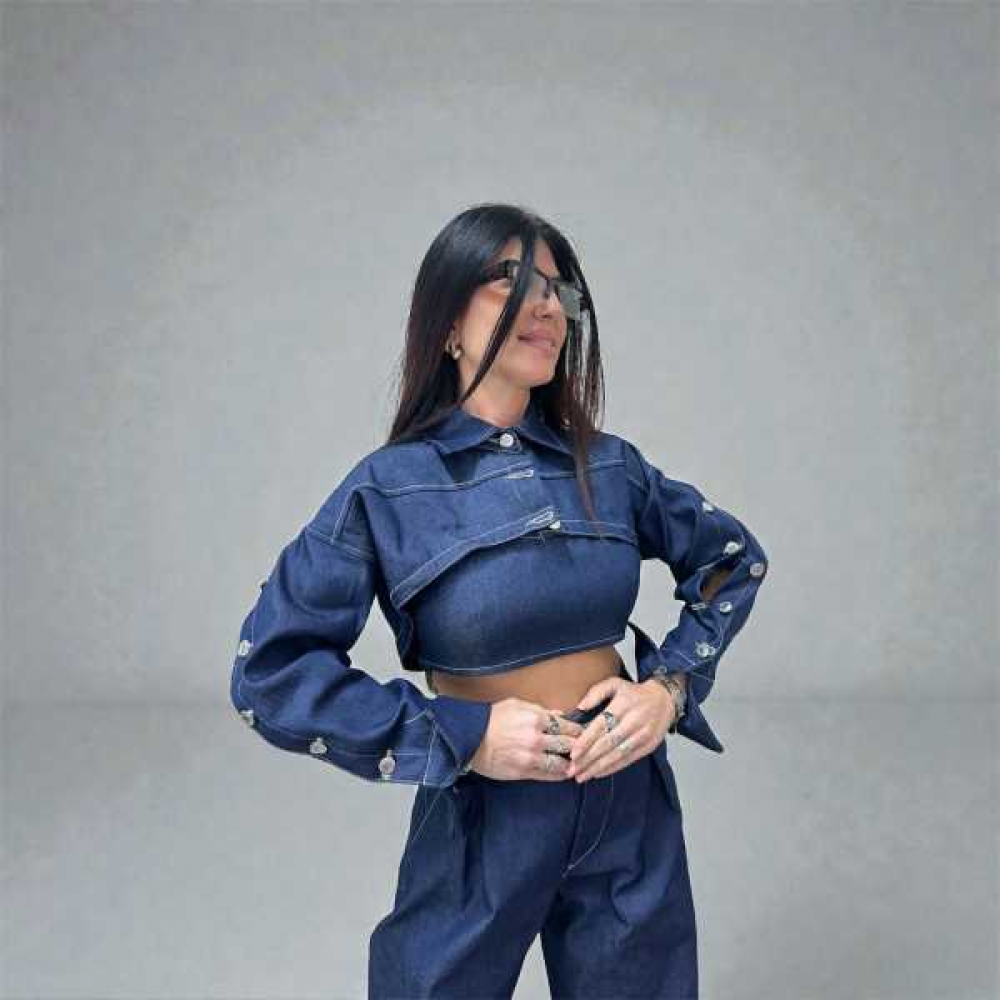Il Coprispalle De-costruito: Il vero pezzo forte del set. Una giacca cortissima (bolero) con colletto classico e maniche lunghe tempestate di bottoni a pressione. I bottoni possono essere aperti per creare spacchi laterali sulle braccia o per rimuovere parzialmente parti della manica, giocando con le asimmetrie.