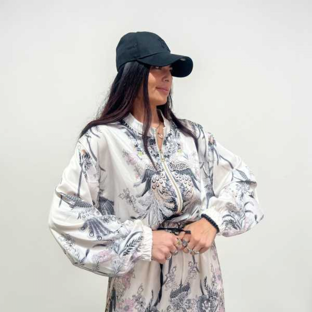 Design Artistico: La stampa è posizionata strategicamente: sul retro e sul davanti spiccano motivi che richiamano piumaggi di pavone e arabeschi floreali nei toni del cipria, grigio perla e nero, su un fondo bianco seta luminoso.