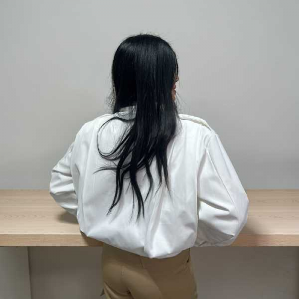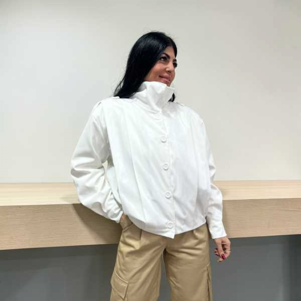 Taglio e Vestibilità: Ha una linea oversize e boxy (quadrata). Le maniche sono ampie e voluminose, con polsini rifiniti che riprendono il dettaglio dei bottoni, creando un effetto leggermente a palloncino.