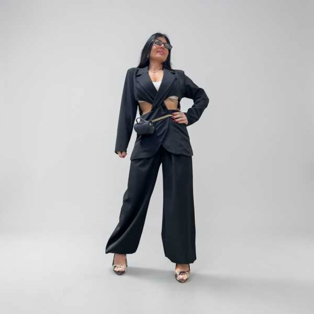 Coordinato due pezzi con giacca cut out e pantalone palazzo con elastico sul retro. Elastico