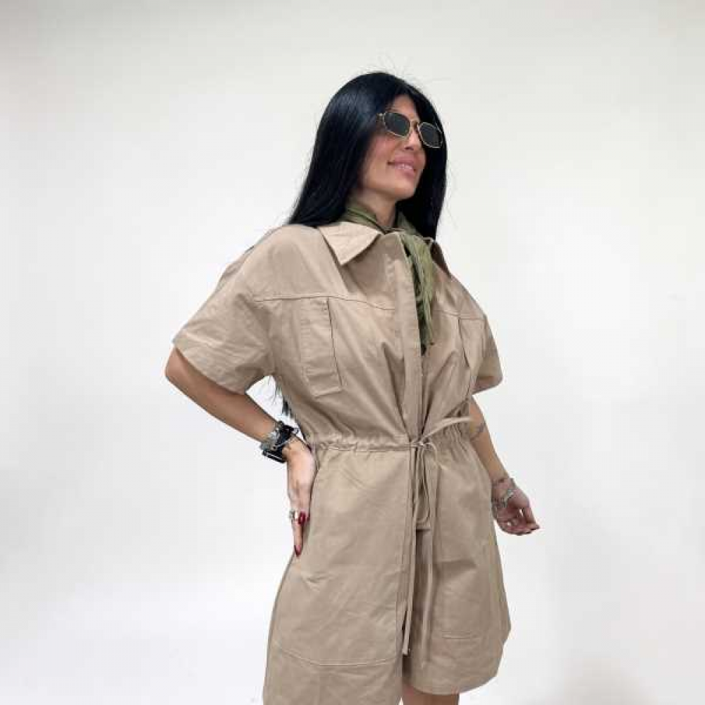 Mini tuta polo maniche a 3/4 con cintura in vita e tasca applicata.