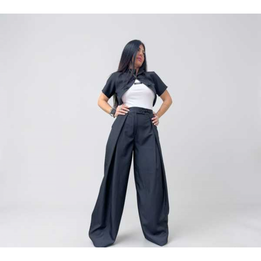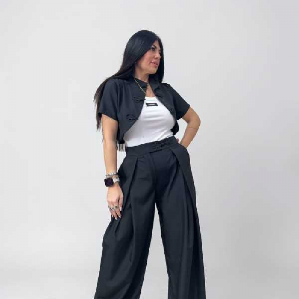COORDINATO COMPOSTO DA TOP MEZZA MANICA CROP E BOTTONCINI RICAMATI CENTRALI E PANTALONE GAMBA LARGA CON ELASTICO SUL RETRO E BOTTONCINO RICAMATO SUL DAVANTI. IN VARI COLORI.